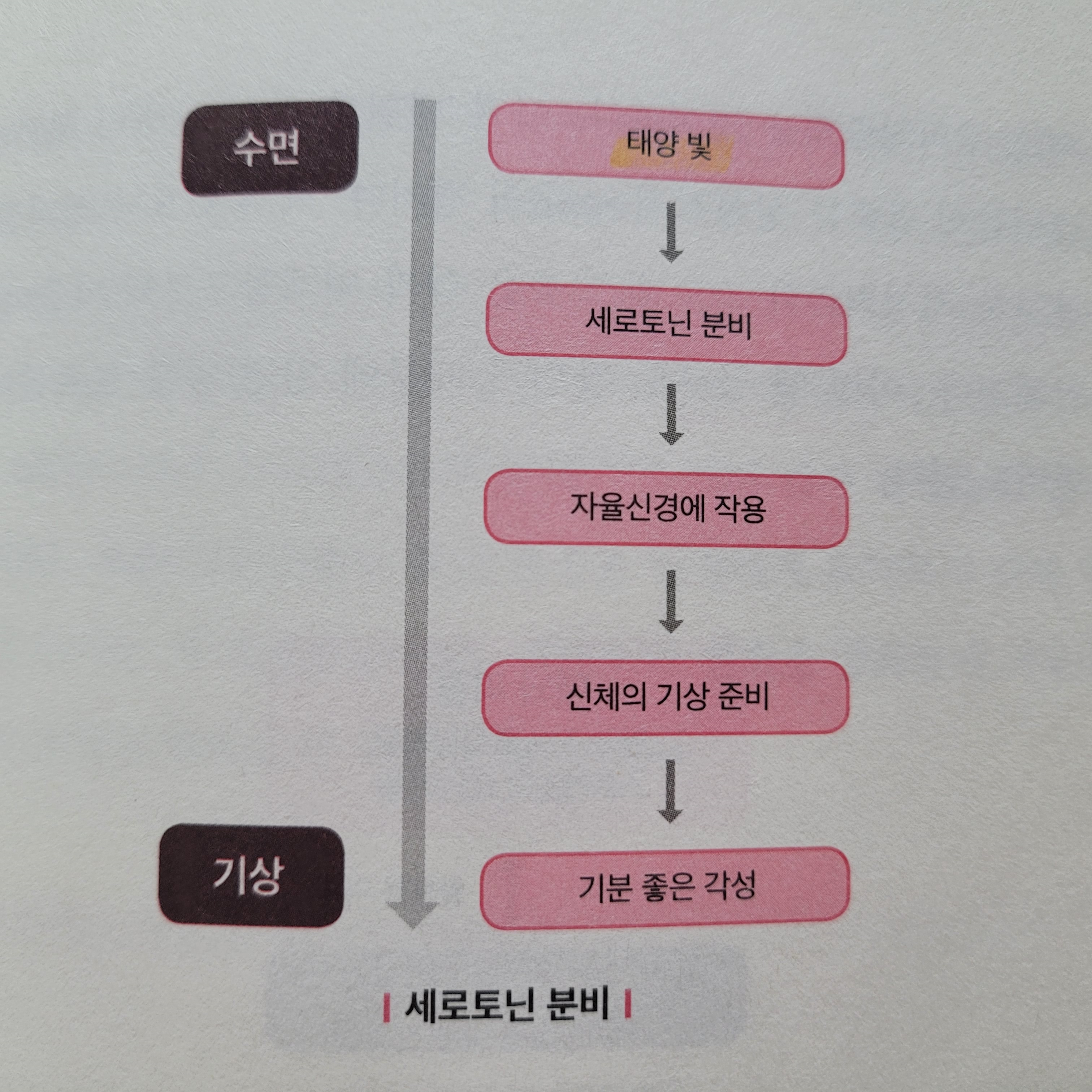 밤에 불을 끄고 자면 세로토닌은 억제되었다가, 창밖에 햇빛이 들어와 망막이 광자극을 받으면 세로토닌이 분비되기